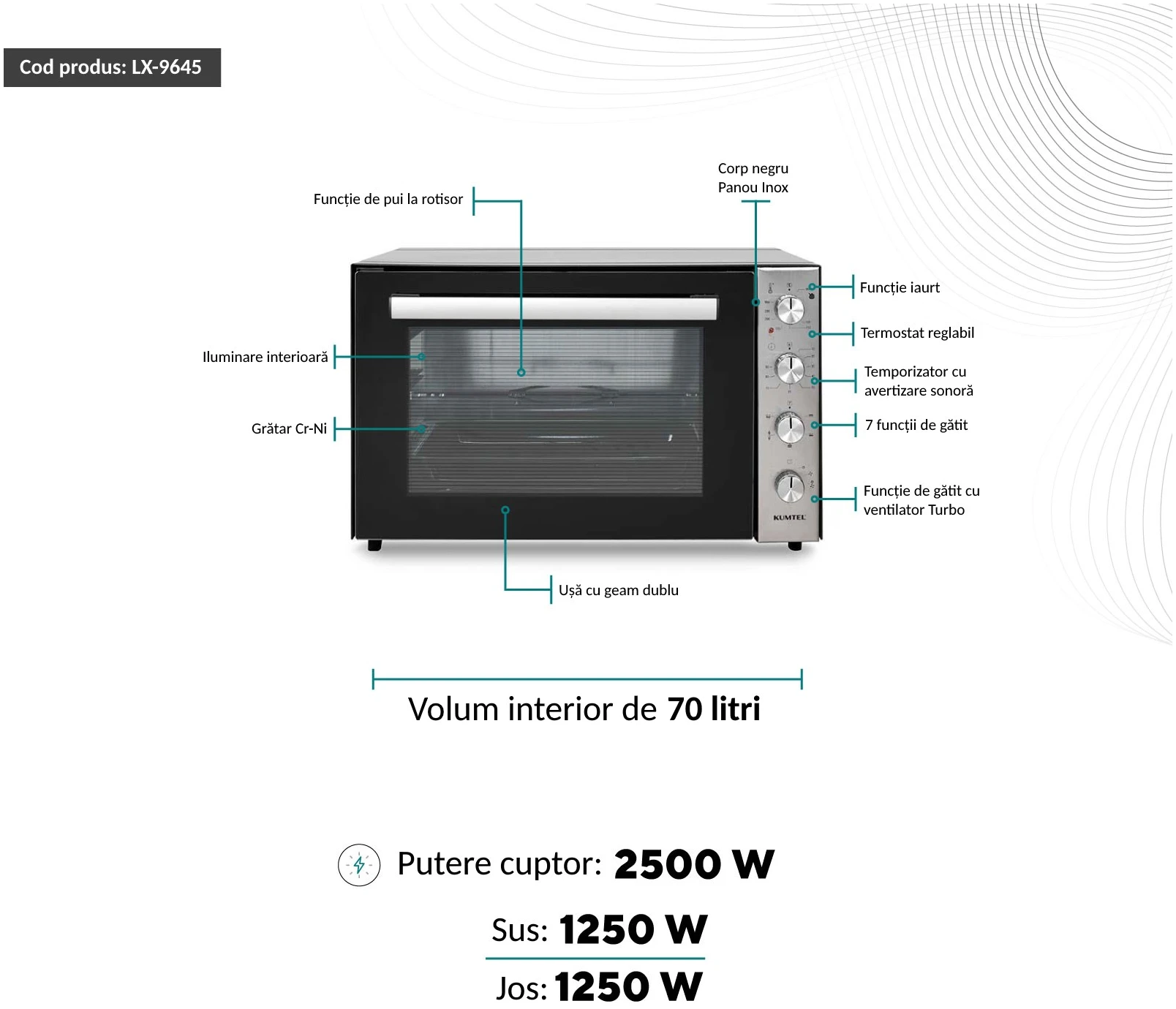 KUMTEL LX-9645 este un cuptor cu o capacitate de 70 litri, cu o putere de 2500 W, dotat cu funcția de gătire cu ventilator turbo și o caracteristică de răsucire a cărnii de pui. Are un design elegant, cu corp negru și panou din Inox. De asemenea, este prevăzut cu iluminare interioară, ceea ce facilitează monitorizarea procesului de gătire.